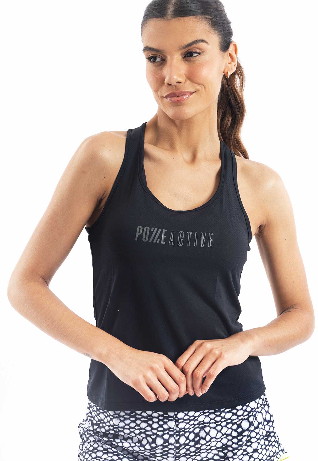 Regata preta com silk frontal em modelagem fit, levemente ajustada com decote redondo na frente e nadador nas costas.