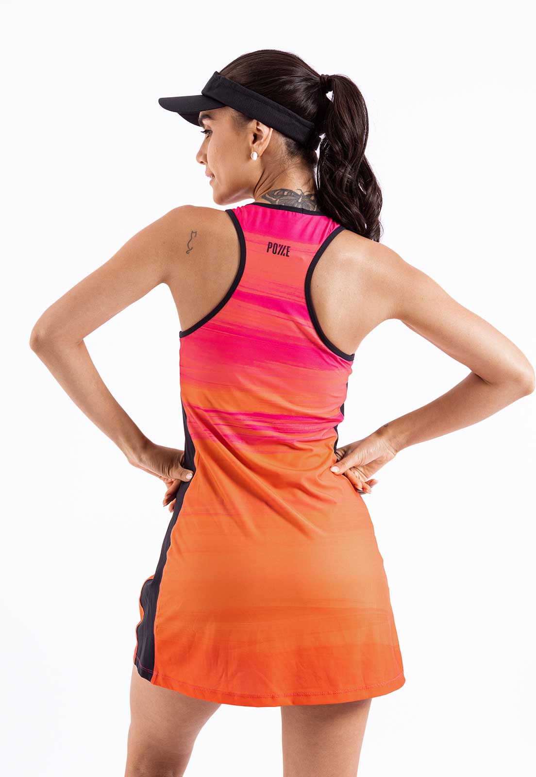 O vestido feminino estampa sunset é ideal para prática do esporte beach tennis e outras atividades físicas. É uma peça cheia de estilo aliada ao conforto e liberdade que os exercícios precisam. Esse vestido fitness possui linda padronagem floral com cores vibrantes em tons de rosa e laranja. As faixas laterais, afinam a silhueta, transformando o que seria somente um vestido e um look super poderoso.