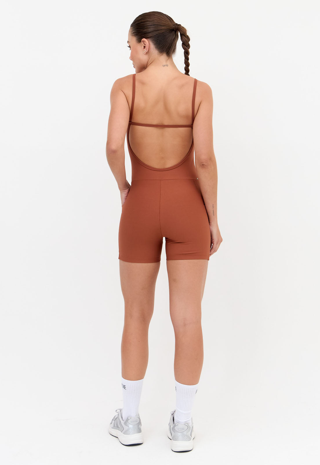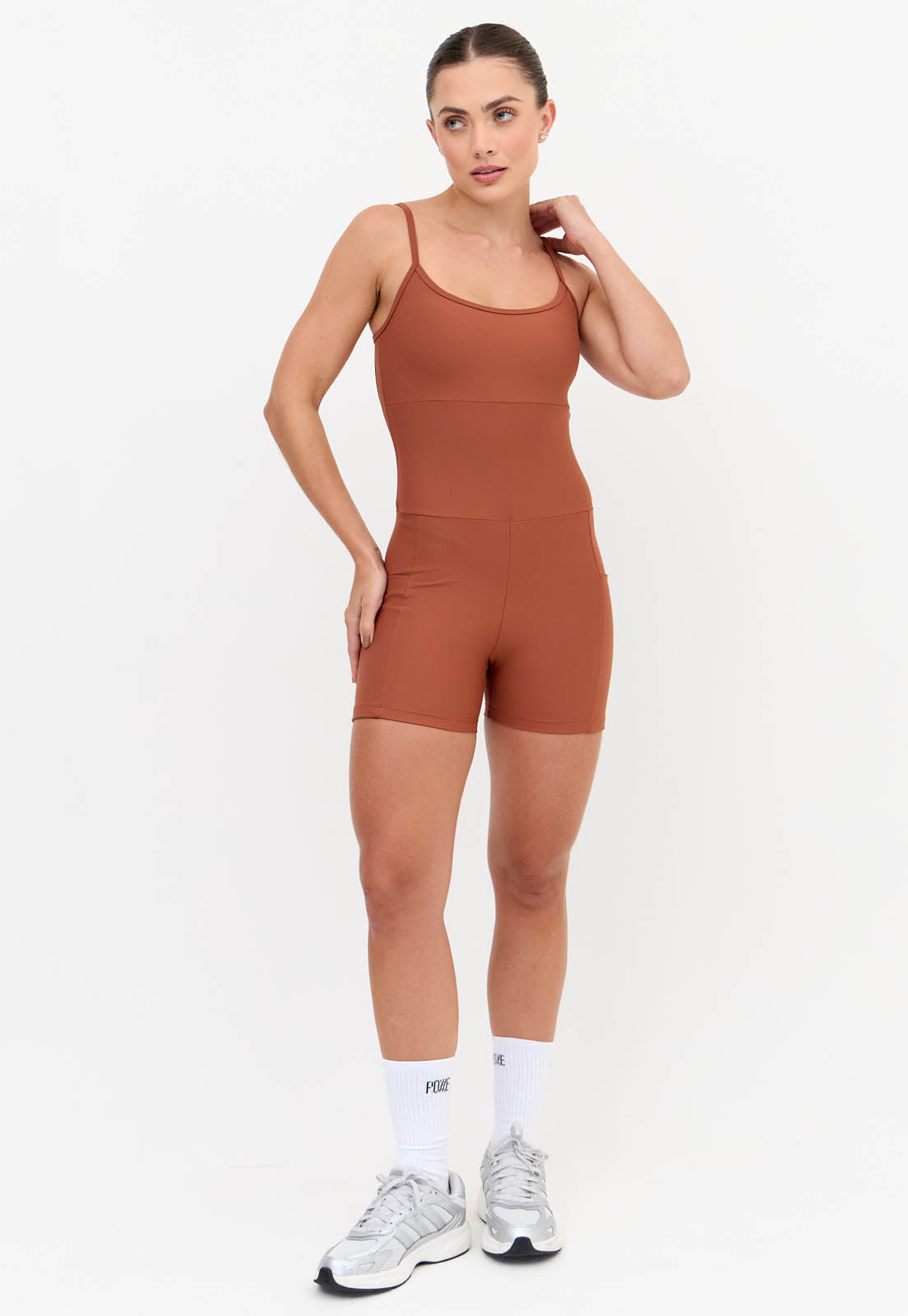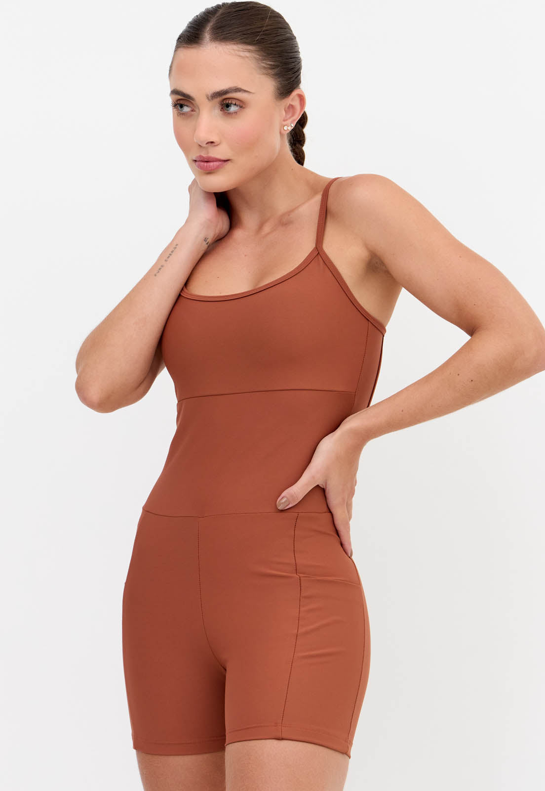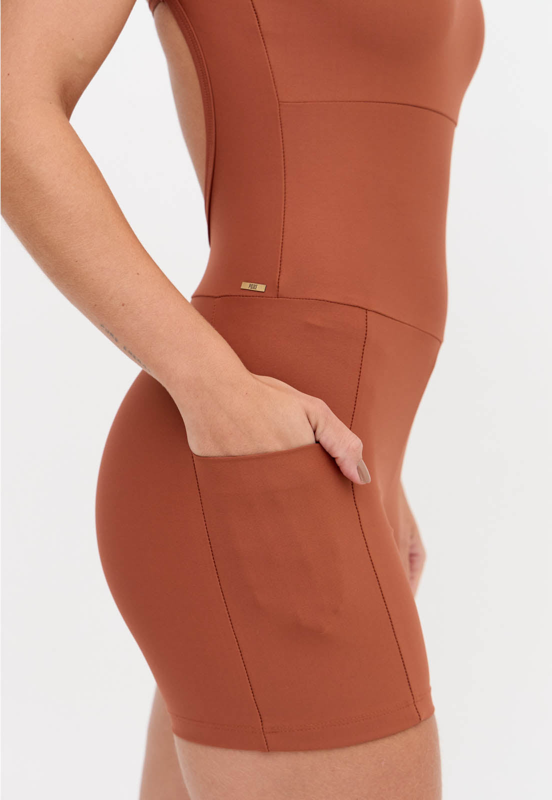 Macaquinho curto liso marrom com bolsos Aura